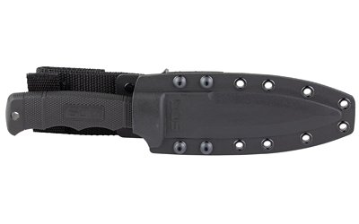 Thick and durable compact tactical fixed blade with spine rasp and glass-reinforced nylon handle. Available with MOLLE compatible nylon sheath.